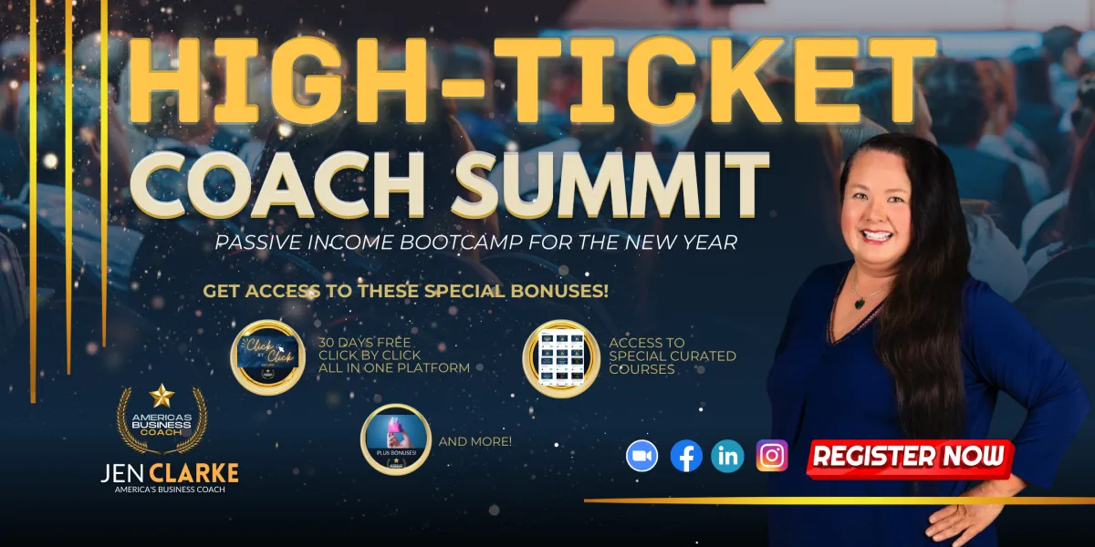 The "High Ticket Coach Summit" with Our Exclusive Premium Clients & Passive Income Bootcamp! Will Offer You the Secrets to Growing Your Business in 2024, making an impact in the lives of your clients and those that YOU serve to start achieving financial success in doing what you do best! Becoming a High Ticket Client.